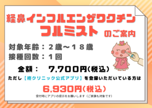 今年度は通常ワクチンに加え、経鼻インフルエンザワクチン【フルミスト】も実施します!