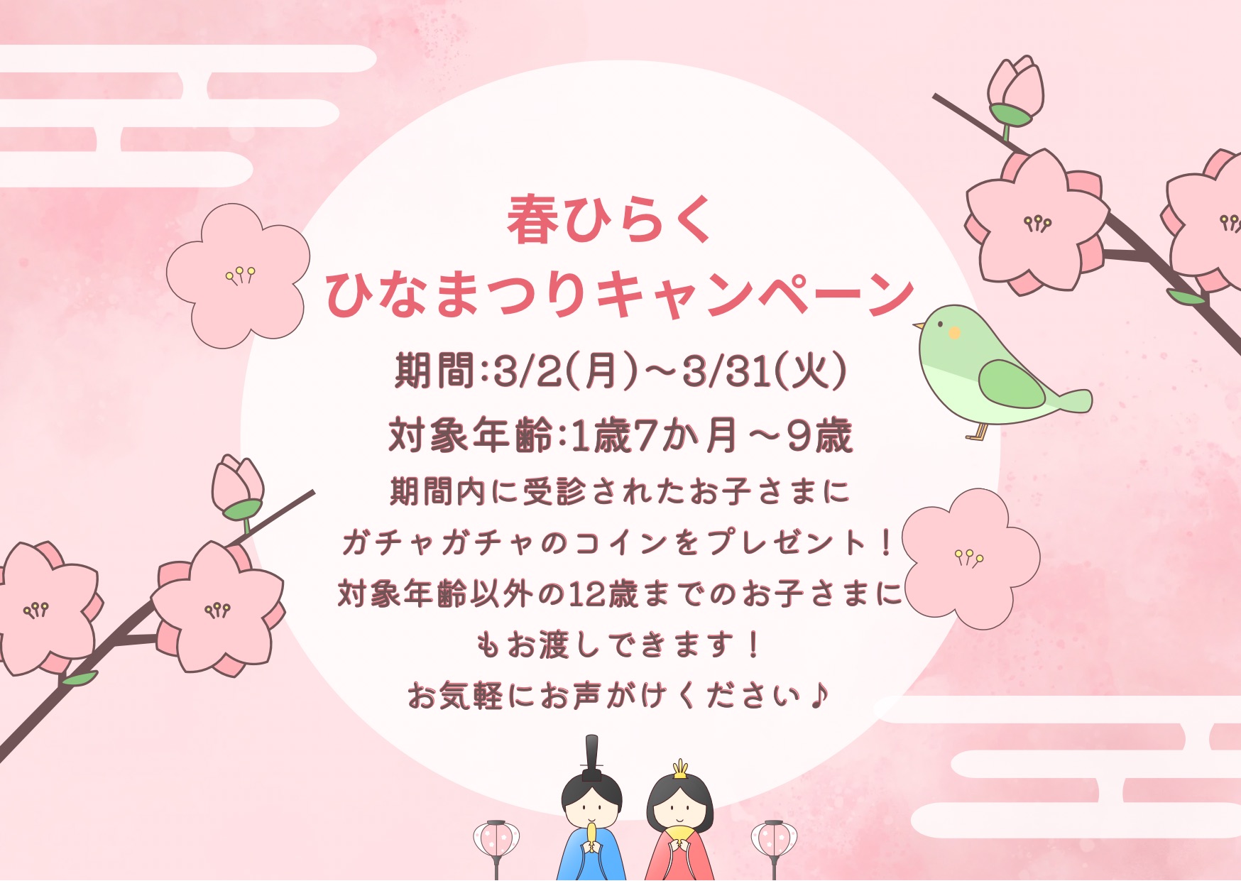 新着情報(詳細) 3月 ガチャイベントのお知らせ (2026-02-25) 3月も引き続きガチャイベントを開催いたします♪ 期間:3月2日(月)〜3月31日(火) 対象年齢:1歳7ヶ月〜9歳の期間中に受診されたお子様 ※対象年齢外でも12歳までのお子様にはプレゼントいたします! ご希望がございましたら気軽にスタッフにお声かけください♪ 一覧へ戻る