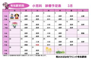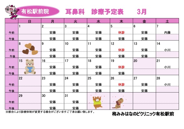 新着情報(詳細) R8年3月 診療予定表 (2026-02-20) R8年3月の診療予定表です。 ご受診の際は参考になさってください。 【耳鼻科】 毎週木曜日 午前の診療は、休診をいただいております。 ご不便をおかけいたしますが、ご理解・ご協力のほどよろしくお願いいたします。 【小児科】 24日は医師都合により午前のみの診療となっております。 一覧へ戻る