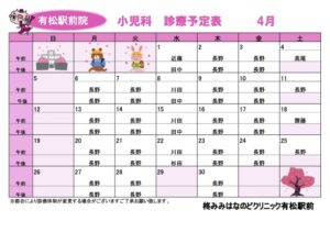 新着情報(詳細) R8年4月 診療予定表 (2026-03-13) R8年4月の診療予定表です。 ご受診の際は参考になさってください。 【耳鼻科】 毎週木曜日 午前の診療は、休診をいただいております。 ご不便をおかけいたしますが、ご理解・ご協力のほどよろしくお願いいたします。 【小児科】 一覧へ戻る